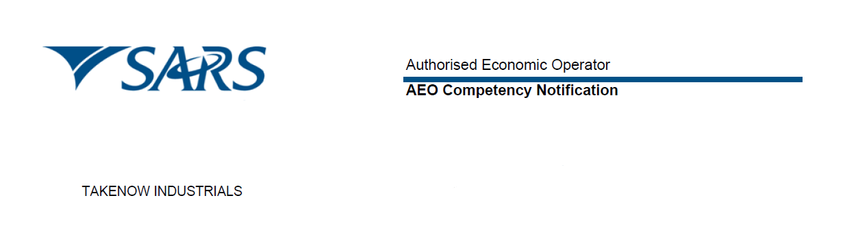 On the 18th of June 2024, takeNOW Industrials (PTY) Ltd t/a takeX proudly completed a key milestone by achieving an 80% score on the SARS AEO Assessment. This marked a significant step toward obtaining our Authorized Economic Operator (AEO) accreditation from SARS.